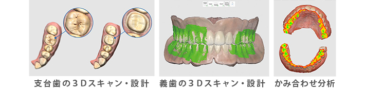 ![]() ![]() 口腔内スキャナーは、高解像度の光学カメラを搭載しており、歯や歯ぐきの形状を細部まで精密に撮影します。 撮影したデータは、拡大・強調・比較などのフィルタリング処理が可能で、虫歯や詰め物の状態、歯の形態を多角的に確認できます。 ![]() スキャンしたデータは専用のソフトウェアで処理され、歯の形や噛み合わせの情報を360度、立体的に再現します。 歯1本単位、支台歯(被せ物の土台となる歯)単位でも必要な部分だけを正確に抽出できるため、補綴物(詰め物・被せ物)の設計精度が向上します。 ![]() ![]() 噛み合わせは、歯科治療において非常に重要な要素です。ほんのわずかなズレでも、違和感やトラブルの原因になります。 口腔内スキャナーでは、 上下の歯の位置関係